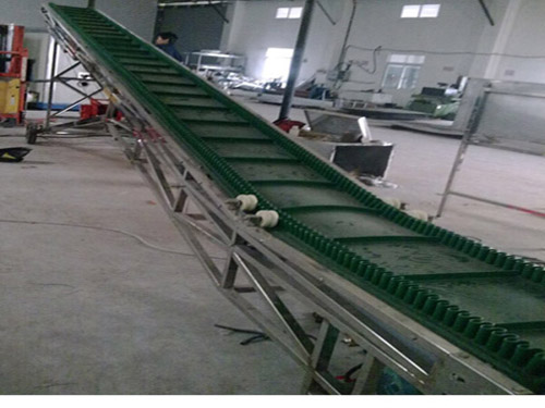 擋邊帶由基帶、擋邊和隔板組成,基帶外觀同曾通輸送帶,但橫向剛度更大:擋邊為波浪狀:陋板按其不 的斷面可分為T型、C型和TC型。T型適用于傾角β≤40°場合,C型適用于傾角β>40°且物料流動(dòng)性較好的場合,TC型適用于傾角β>40°,物料粘性較大,粘度較大的場合。